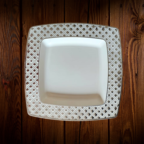 Blanco cuadrado borde detalles plateados. Plato Postre. Unidad.