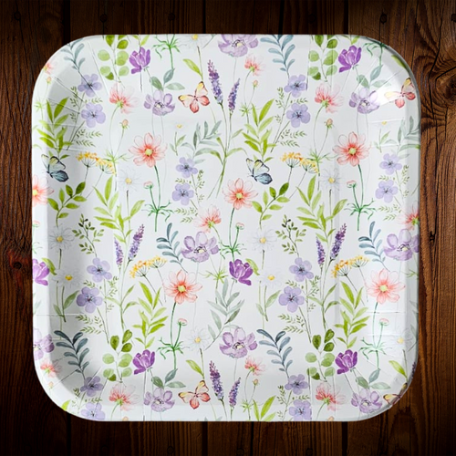 Flores y mariposas. Plato principal cuadrado. 9 pulg. 14 Unid.