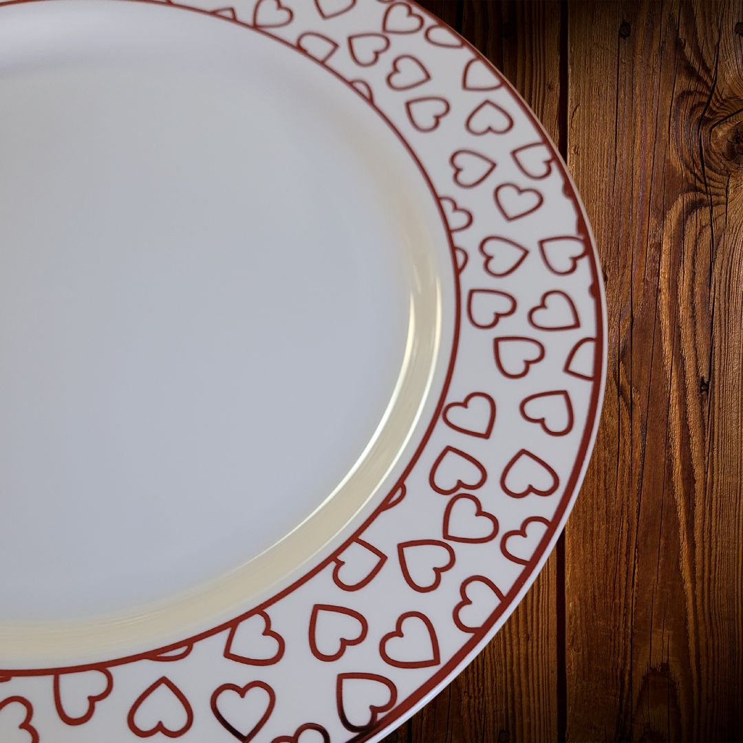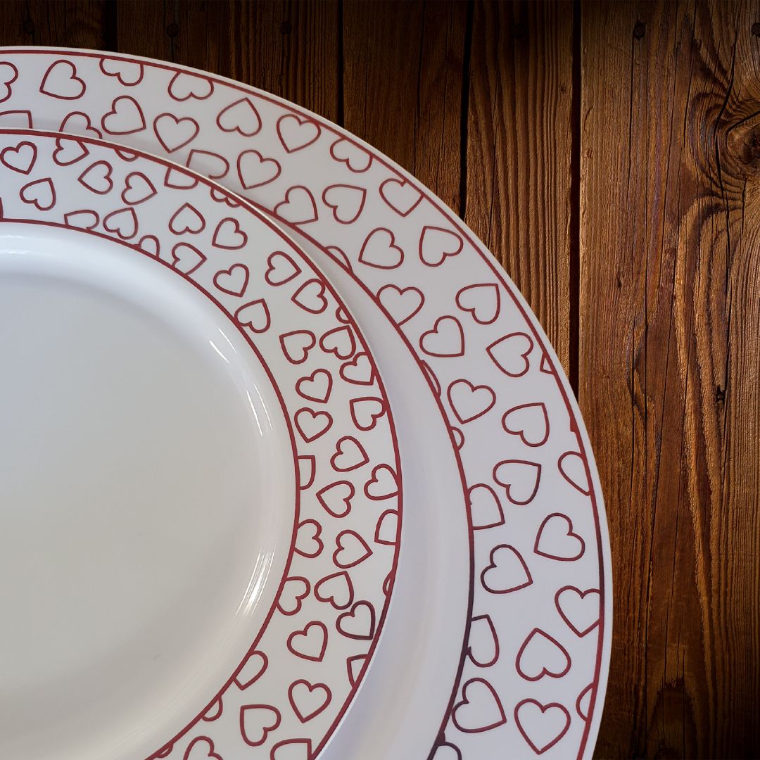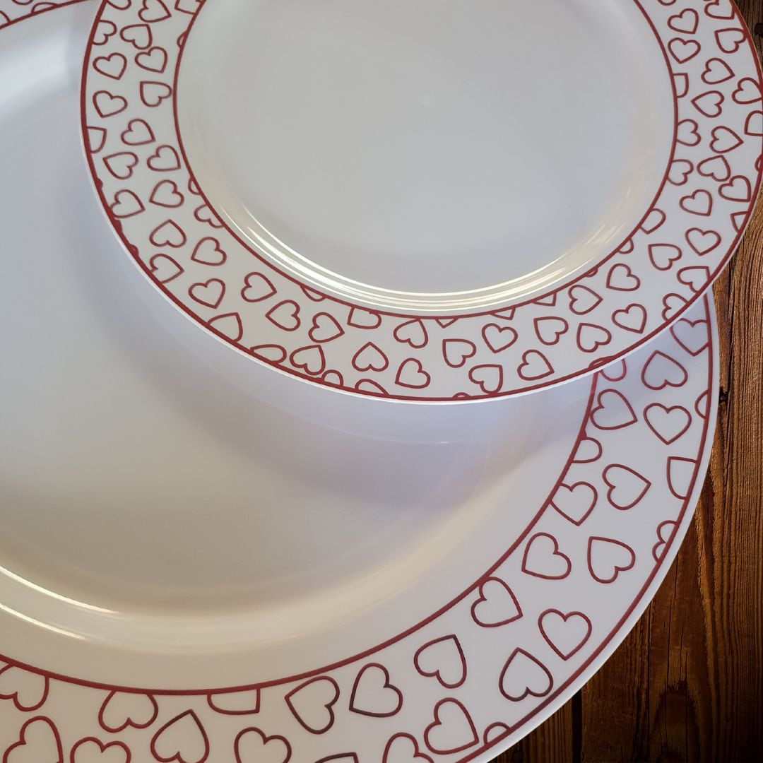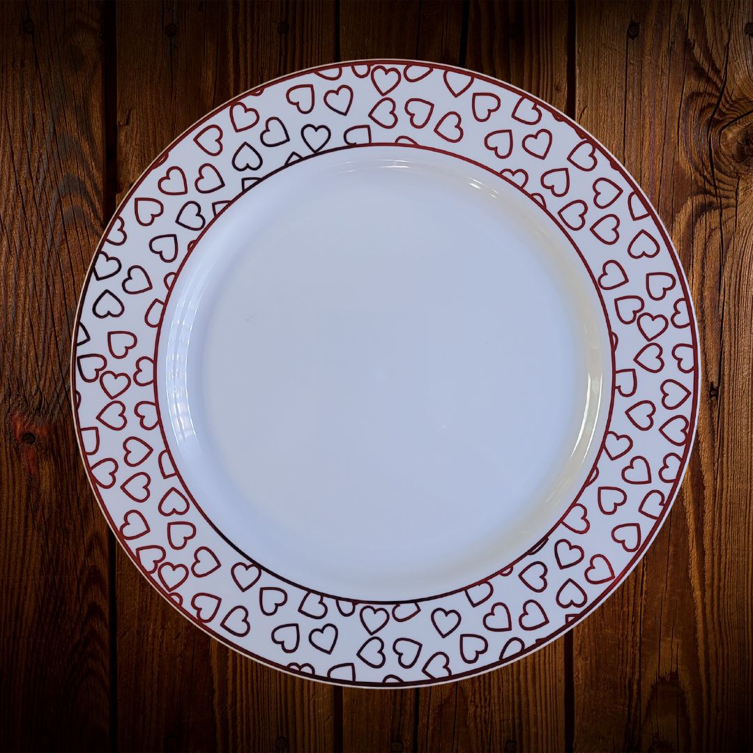 Plato principal con borde de corazones rojos. Media 10.25 pulgadas. Plástico de alta calidad y durabilidad, resistentes a las comidas calientes, puedes partir carnes y servir salsas en ellos sin temor a que puedan romperse. Vive tu mesa!