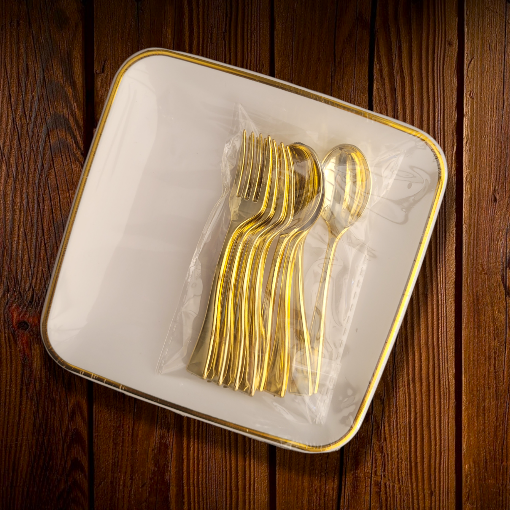 Plato para postre o aperitivo, blanco con borde en color plateado, dorado o rose gold. Cada plato incluye su mini tenedor/cuchara. Plástico de alta calidad y durabilidad.