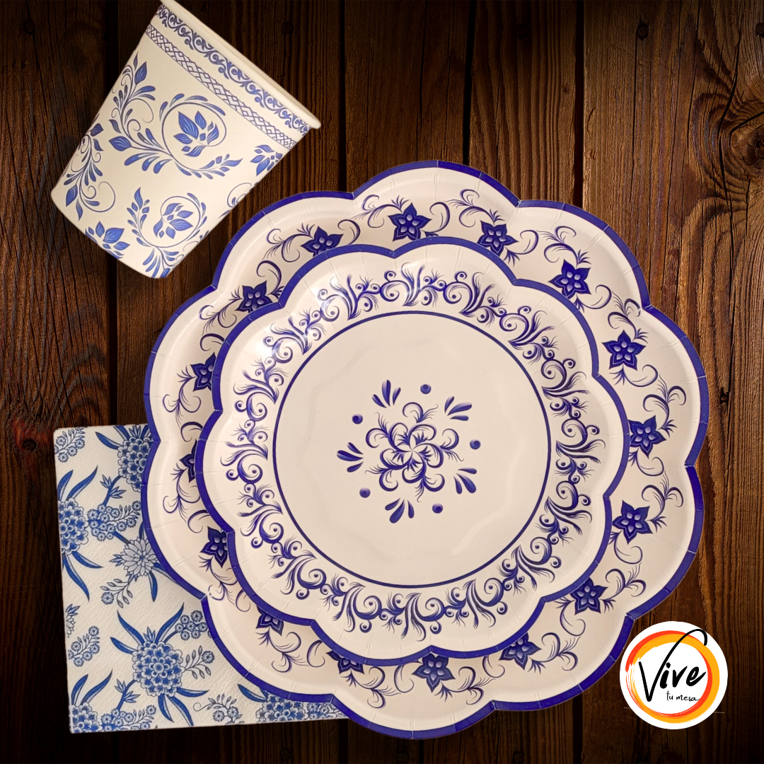 Set de 10 platos principales blanco con diseño azul. Medida 9 pulgadas. Vive tu mesa!