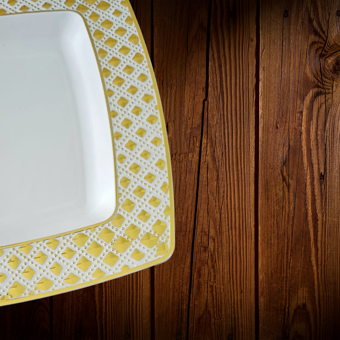 Plato para postre cuadrado con borde con detalles dorados. Plástico de alta calidad y durabilidad, resistentes a las comidas calientes, puedes partir carnes y servir salsas en ellos sin temor a que puedan romperse. Vive tu mesa!
