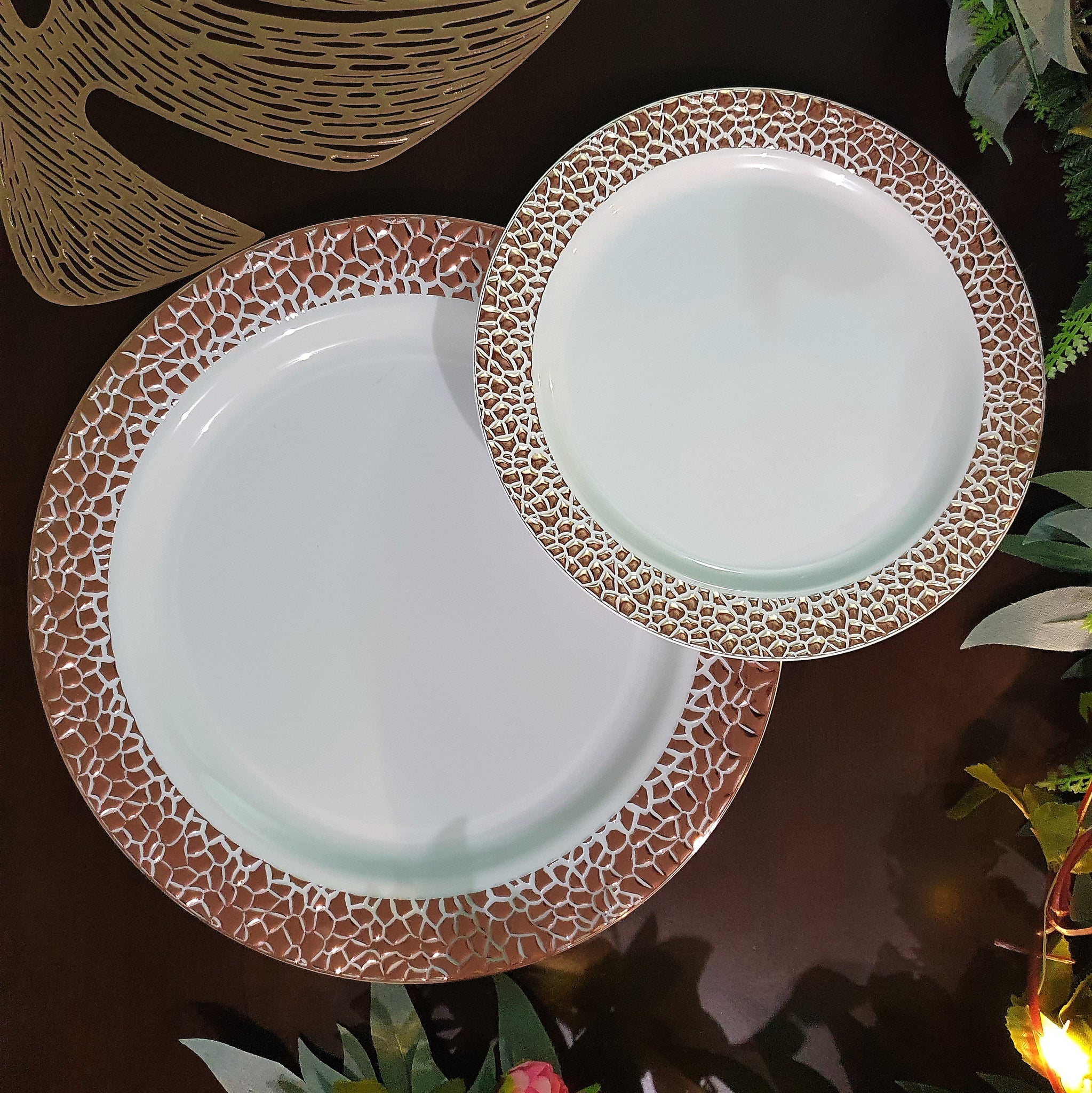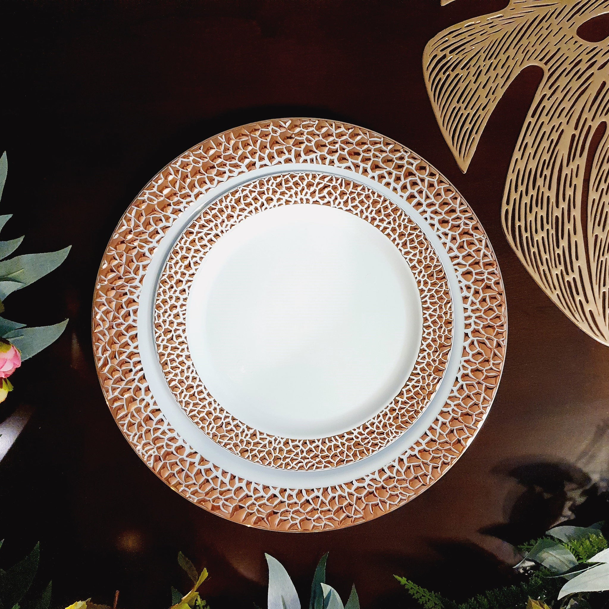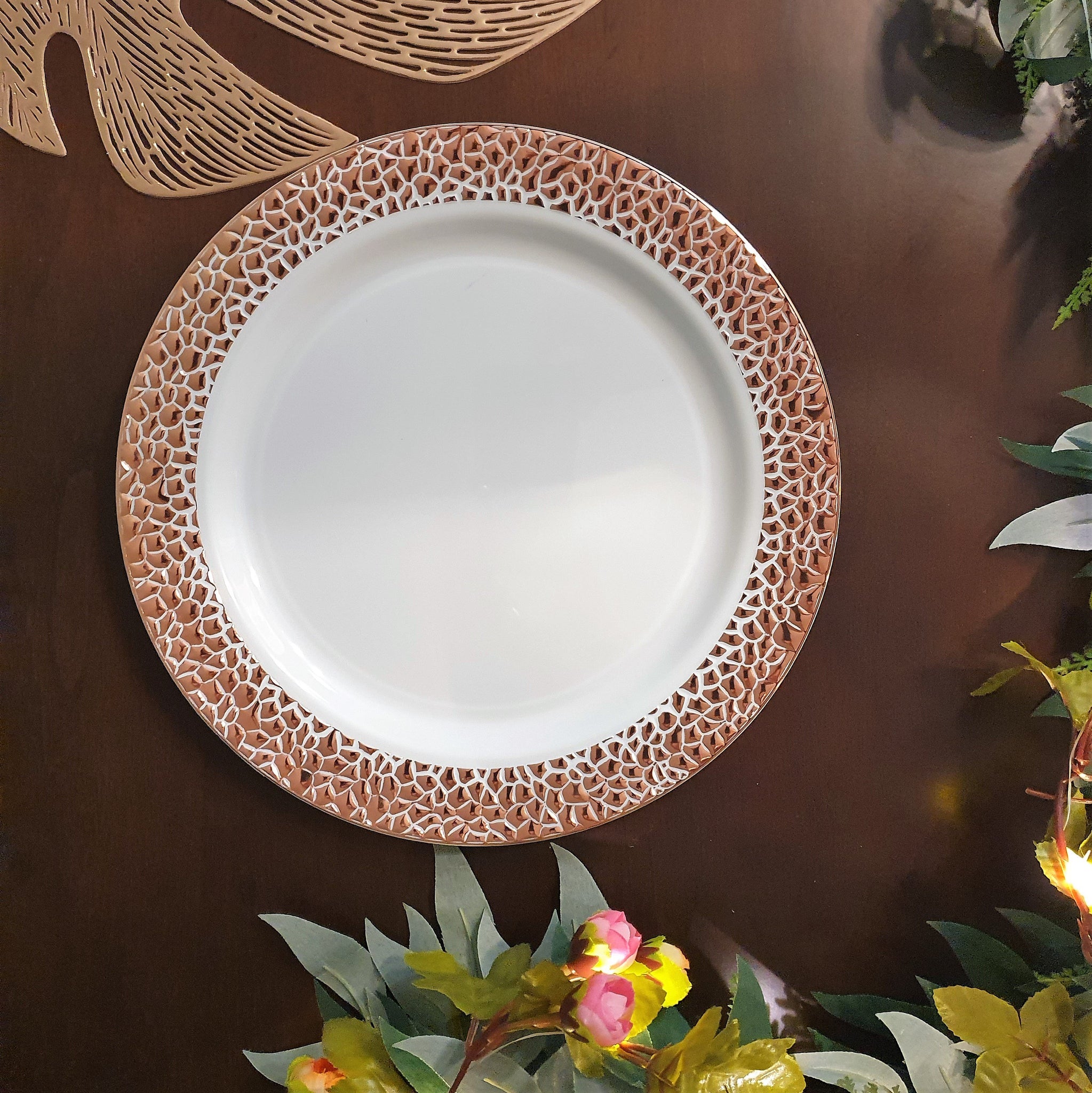 Set de 4 platos principales blancos con borde de textura rose gold. Plástico de alta calidad y durabilidad, resistentes a las comidas calientes, puedes partir carnes y servir salsas en ellos sin temor a que puedan romperse. Vive tu mesa!