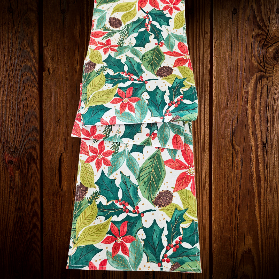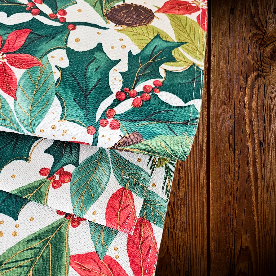 Camino de mesa rectangular blanco con estampado navideño. Fabricado en algodón, forrado. Medidas 33 cm. de ancho y 1.83 mts. de largo
