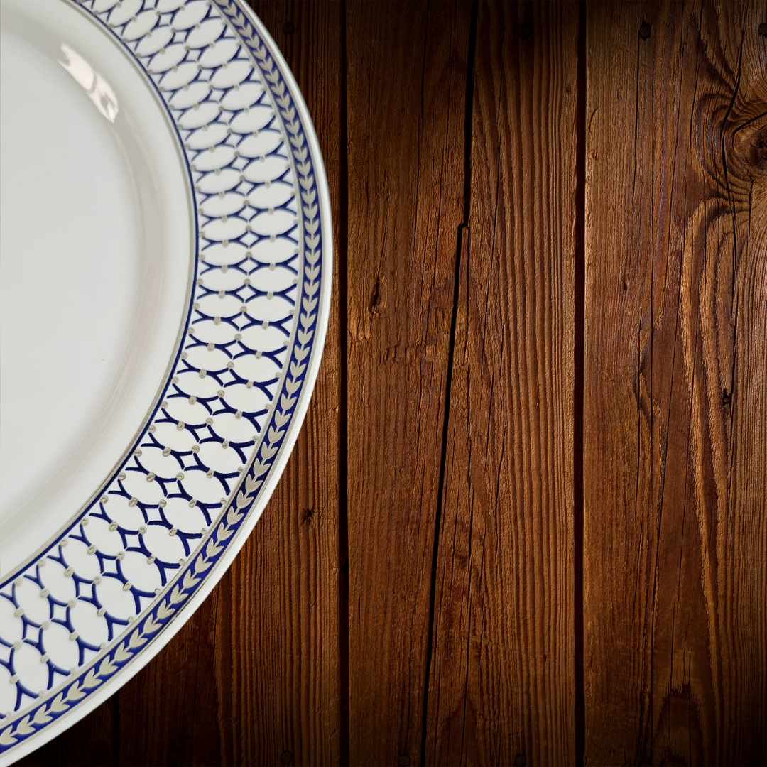 Set Blanco con diseño azul y plateado. Plato Principal. 7 Unidades. ULTIMO SET
