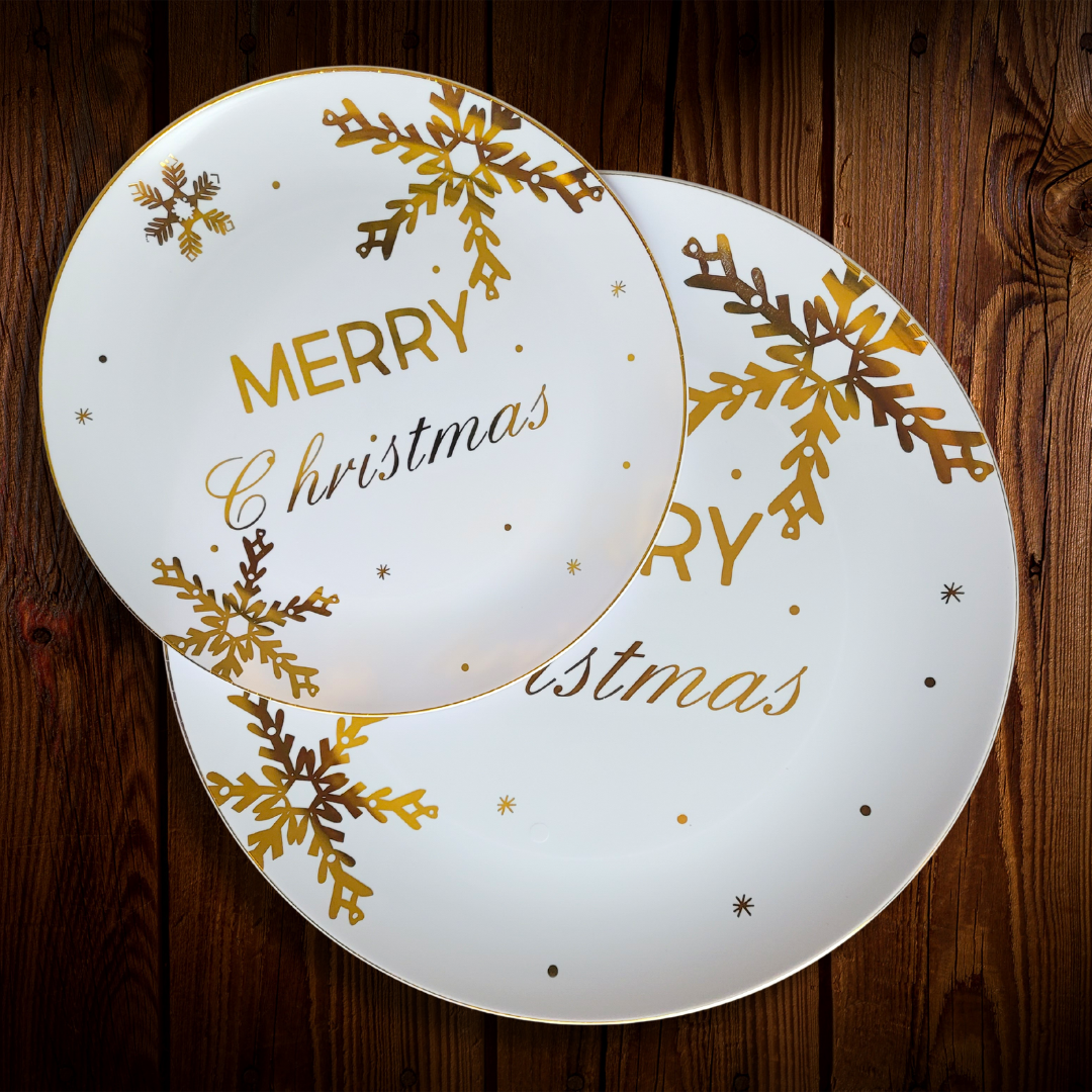 Plato principal plástico blanco con diseño de copos de nieve dorados. Medida 10 pulgadas. Plástico de alta calidad y durabilidad, resistentes a las comidas calientes, puedes partir carnes y servir salsas en ellos sin temor a que puedan romperse. Vive tu mesa!