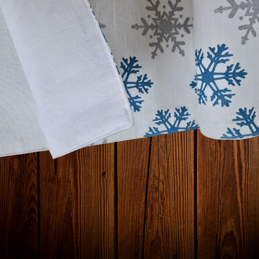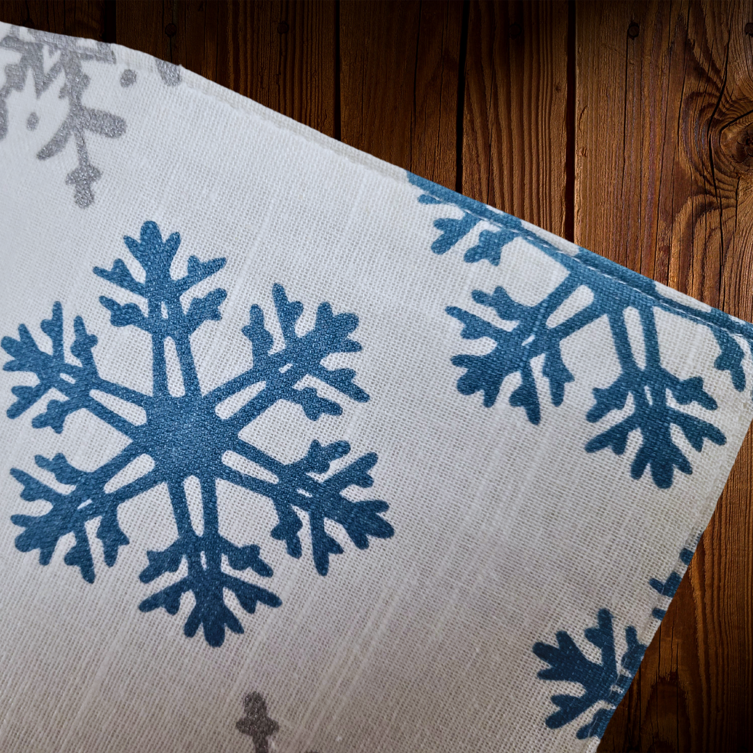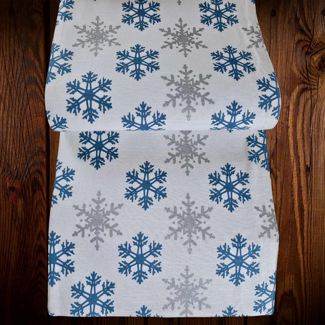Camino de mesa rectangular blanco con estampado de copos de nieve en color azul y plateado. Fabricado en algodón, forrado. Medidas 33 cm. de ancho y 1.83 mts. de largo