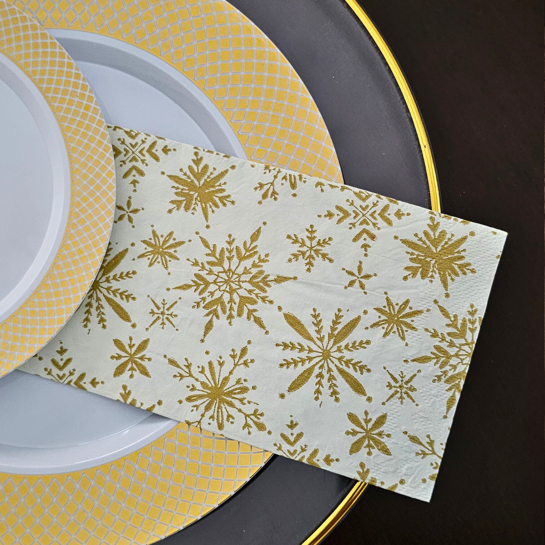 Paquete de 8 servilletas rectangulares ivory con diseño de copos de nieve dorador. Vive tu mesa!