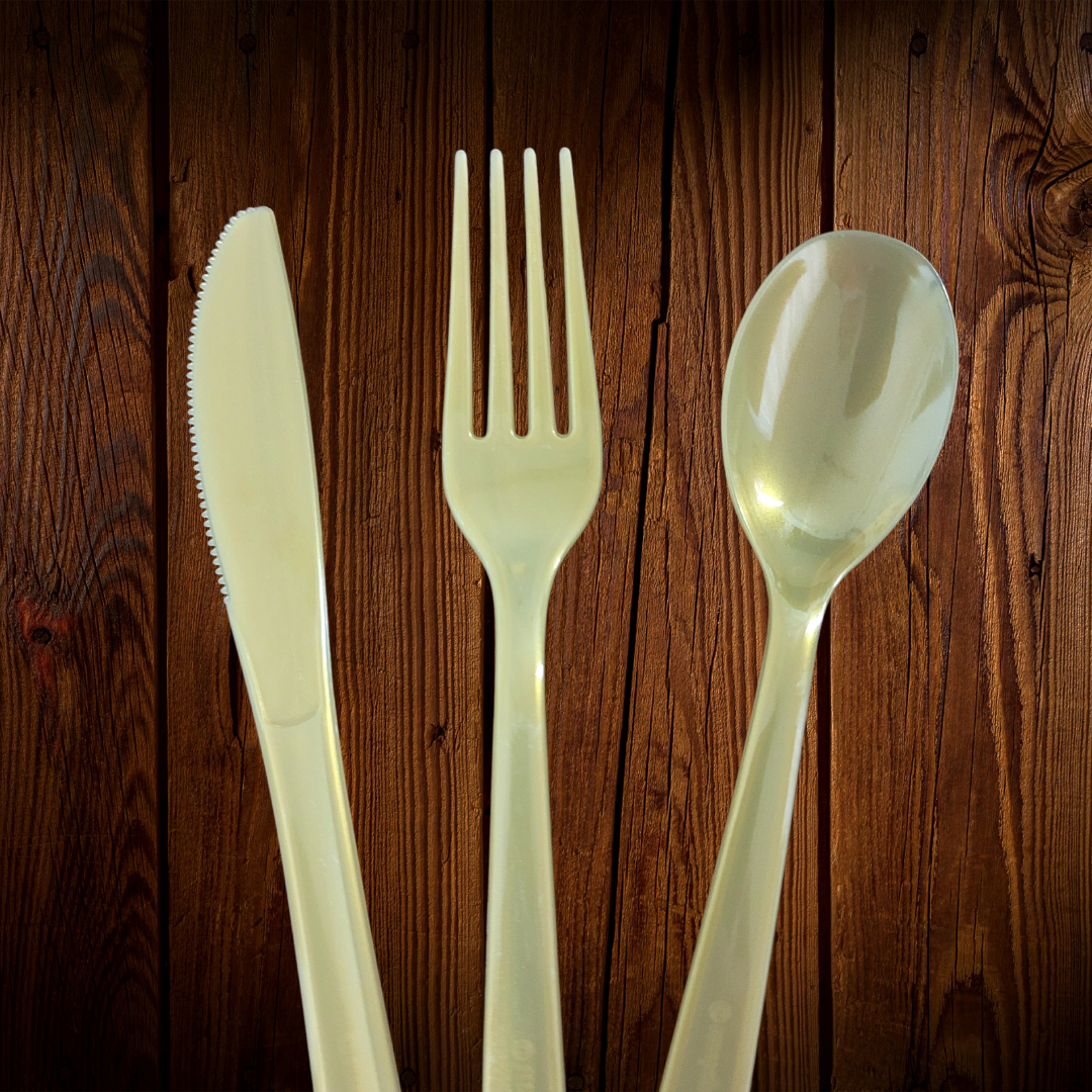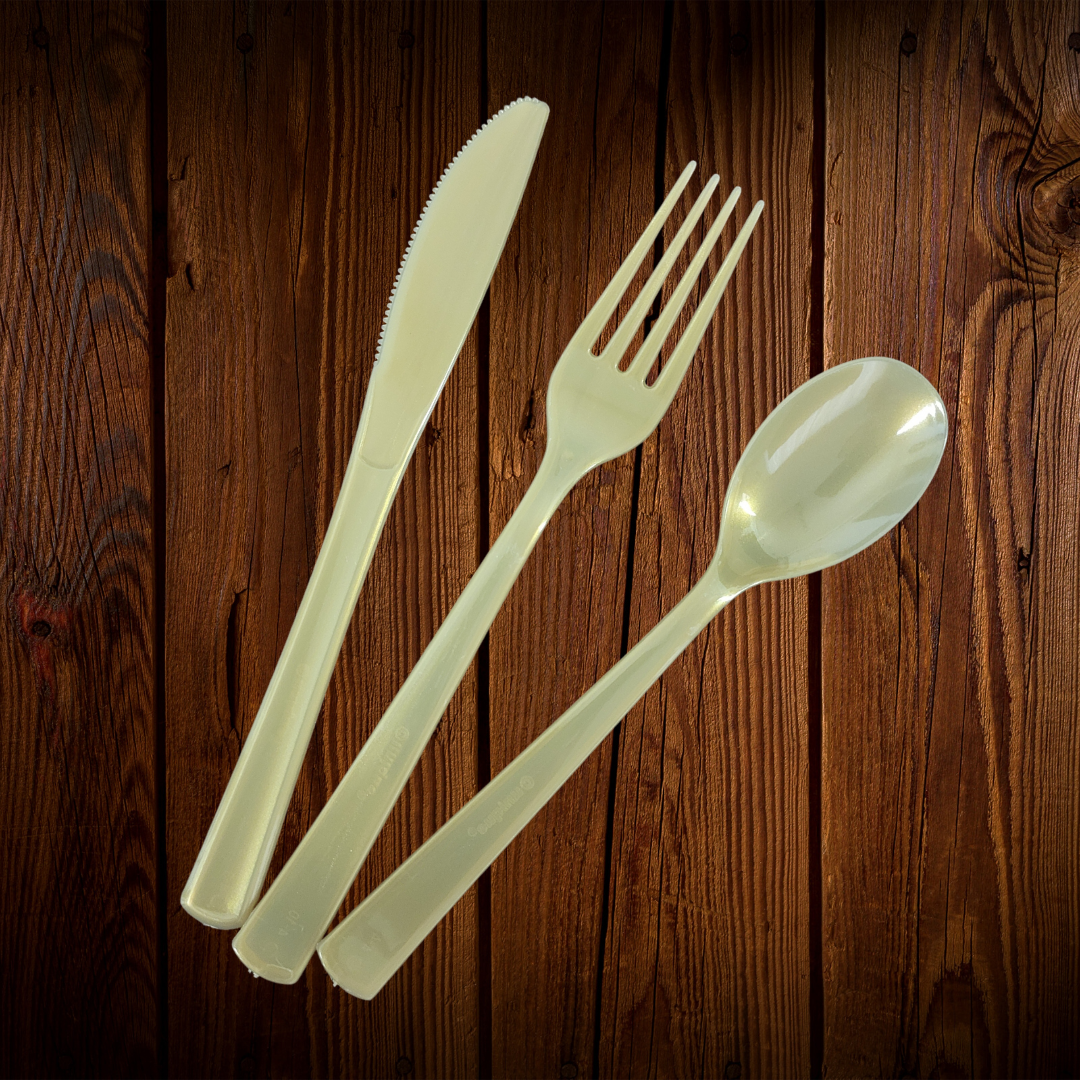 Cubiertos dorado claro mate. Incluye tenedor, cuchillo y cuchara. Plástico de alta calidad y duración. Vive tu mesa!