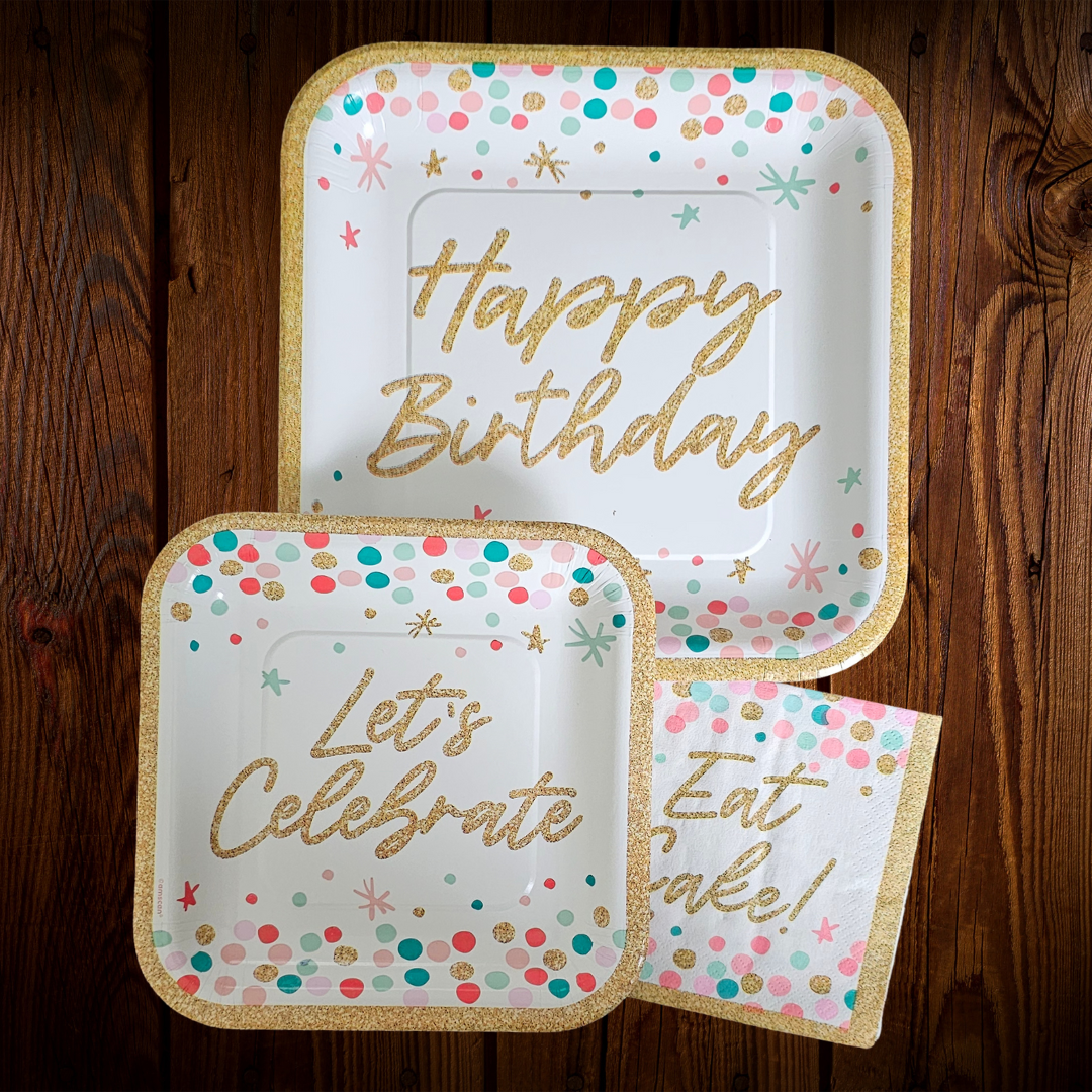 Plato principal cuadrado con diseño Happy Birthday. Diametro 10 pulgadas. Set de 10 platos de cartón. Vive tu mesa!