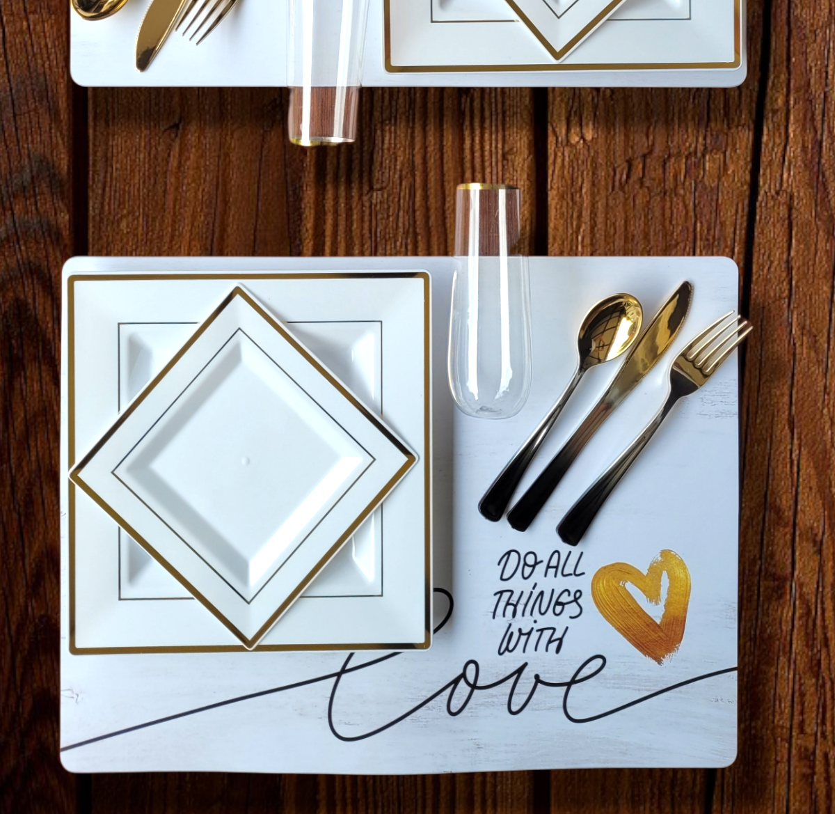 Set de 6 individuales blancos diseño Do all things with Love. Cubierta plastica y base de espuma, repelentes al agua, antideslizantes y reutilizables. Vive tu mesa!
