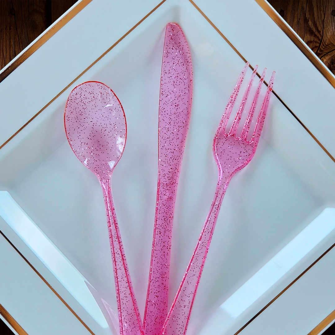Juego de cubiertos rosados con destellos. Incluye 1 tenedor, 1 cuchillo y 1 cuchara. Un toque elegante en tu mesa. Plástico de alta calidad y duración. Vive tu mesa!