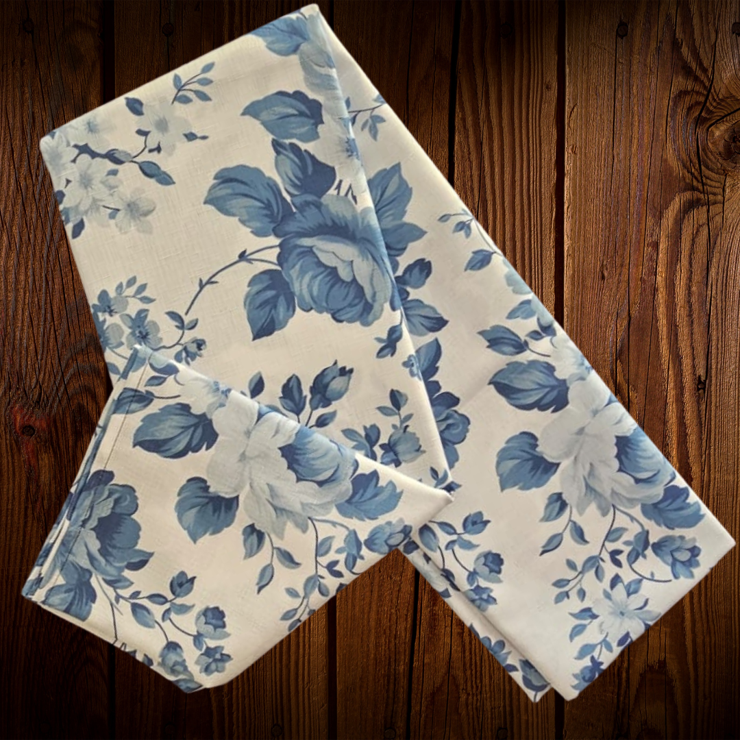 Mantel rectangular blanco con estampado azul. Fabricado en polyester. Para mesa de 6 a 8 personas. Medidas 60" por 84" (152 cm. de ancho por 213 cm. de largo). Vive tu mesa!