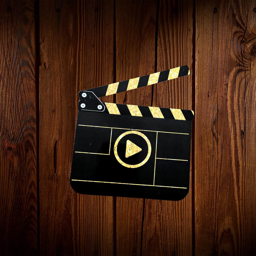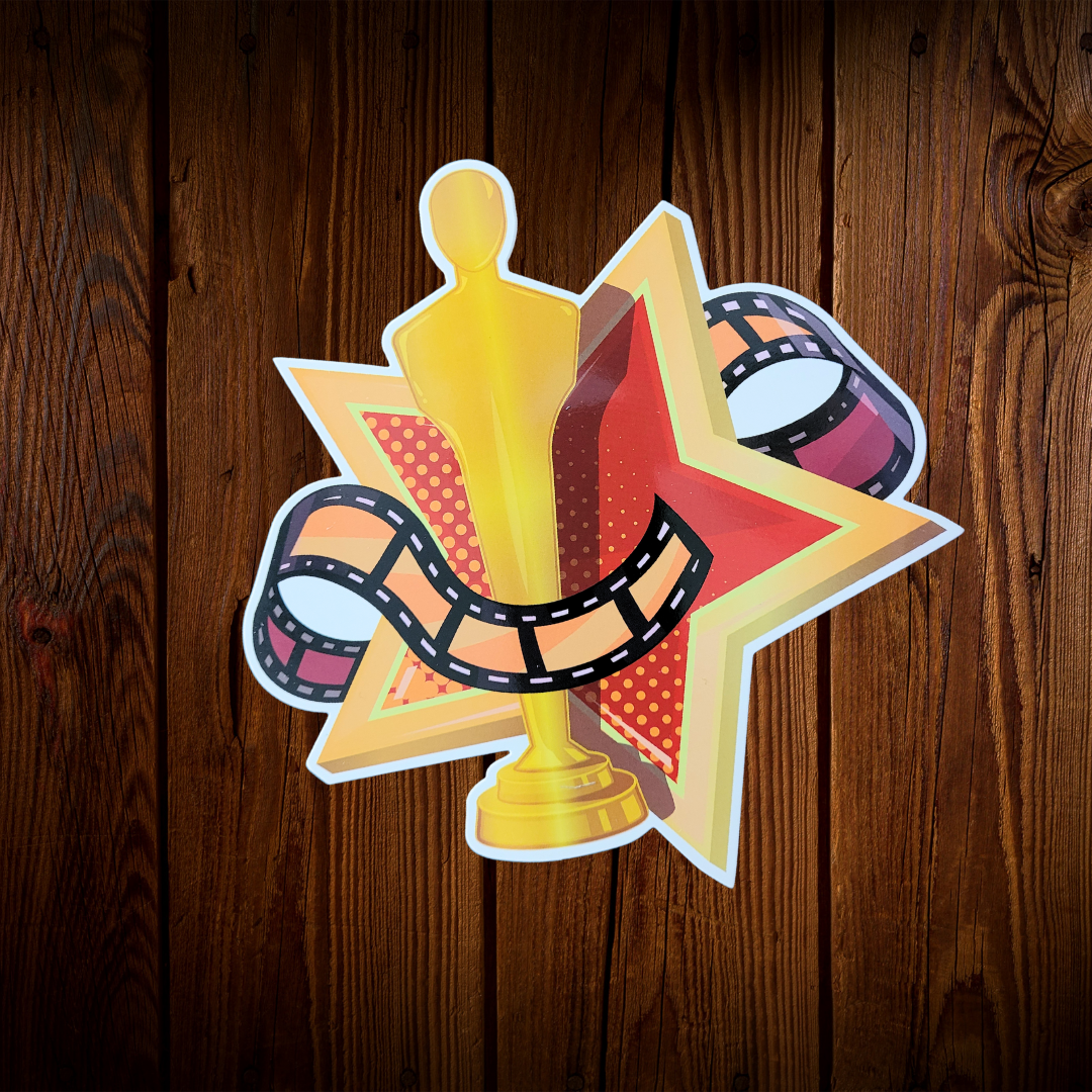 Ocho patrones diferentes. Medidas entre 5 y 7.5 pulgadas, fabricadas de cartón impreso doble cara brillante con laminación, diseño: tablero de marcador de escena, palomitas de maiz, cámara, pelicula, letrero de luz, microfono, boleto y trofeo.