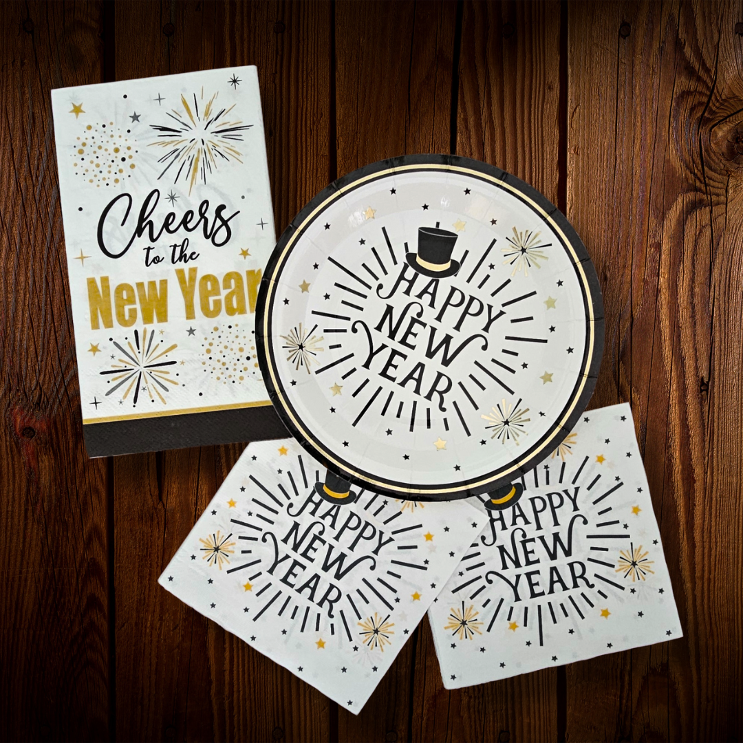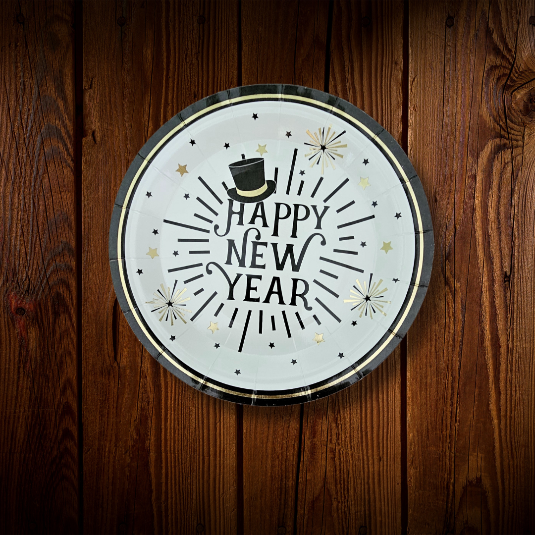 Platos para aperitivo diseño borde Happy New Year. 7 pulgadas de diámetro. Set de 8 platos de cartón. Vive tu mesa!
