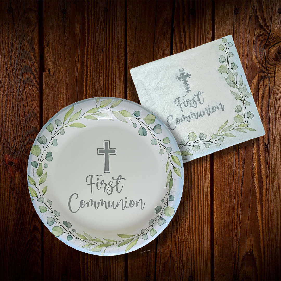 Servilletas cuadradas pequeñas con diseño Primera Comunión y borde celeste. Paquete de 20 servilletas. Vive tu mesa!