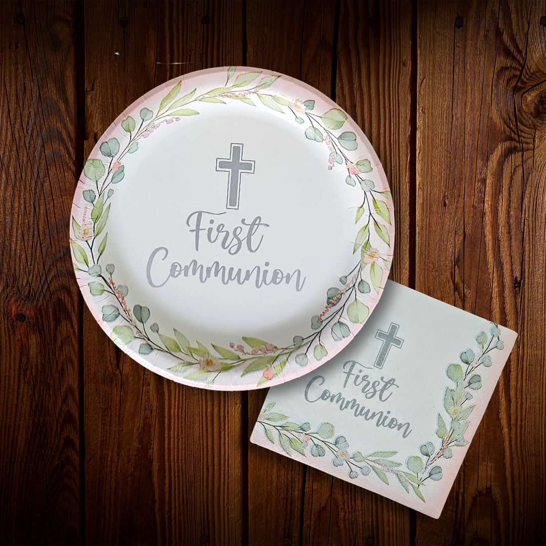 Plato para postre con diseño primera comunión y borde rosado. Diametro 7 pulgadas. Set de 10 platos de cartón. Vive tu mesa!