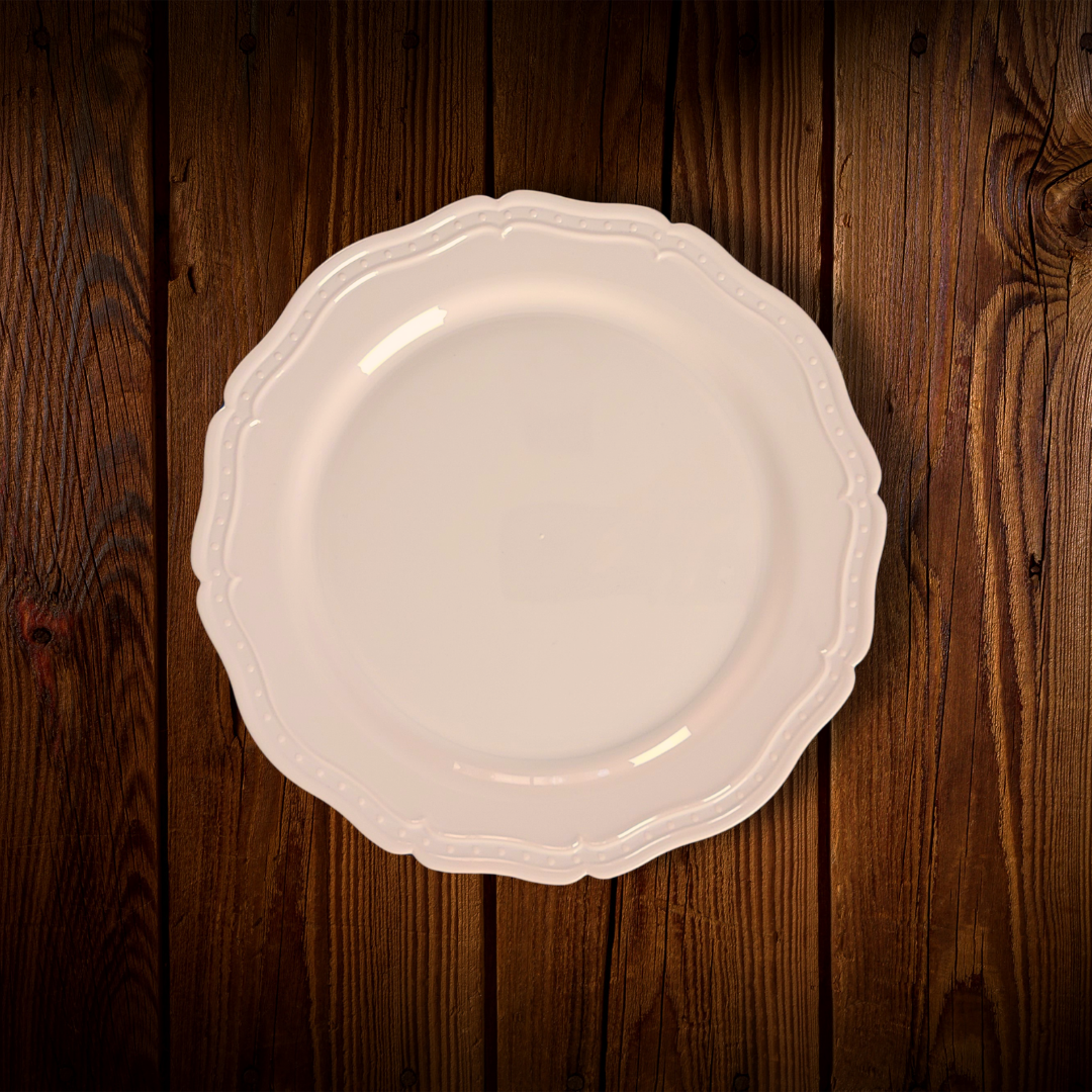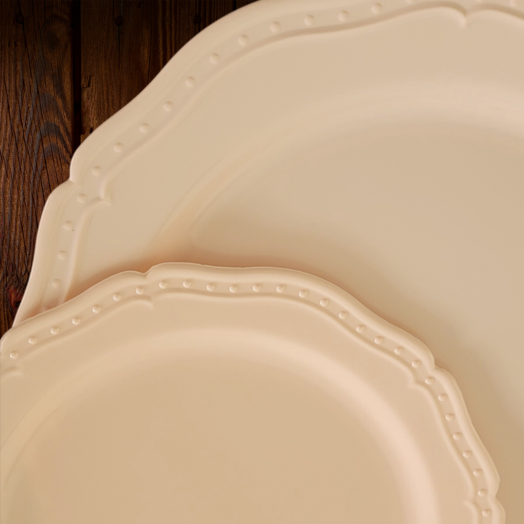 Plato postre rosado pastel con borde de puntos. Plástico de alta calidad y durabilidad, resistentes a las comidas calientes, puedes partir carnes y servir salsas en ellos sin temor a que puedan romperse. Vive tu mesa!