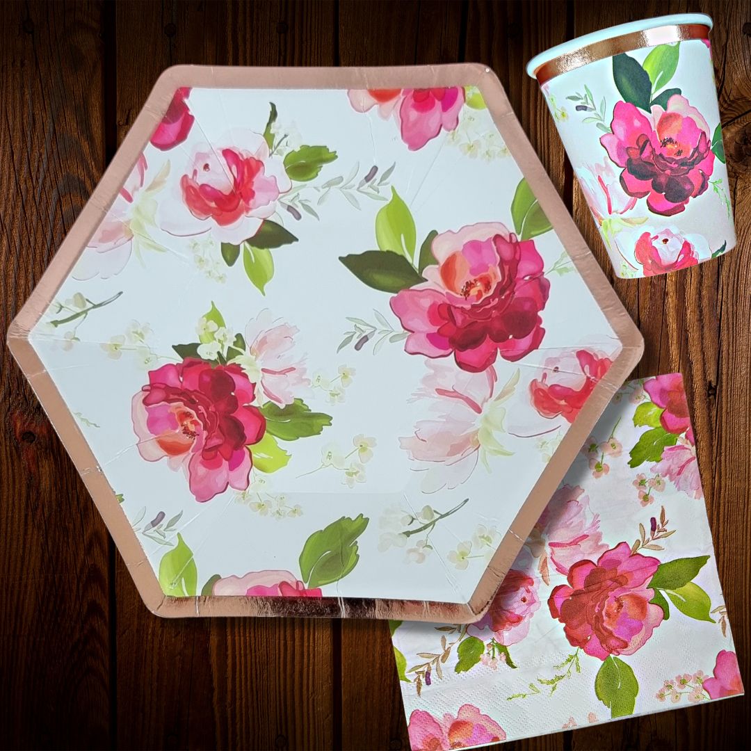 Paquete de 10 vasos de cartón de 8oz. diseño rosas fucsia. Vive tu mesa!
